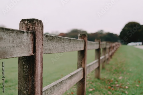 © Aupa, Fototapeta premium Weathered wooden fence stretches into a blurry landscape