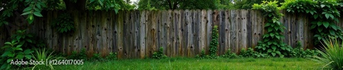 © Phennapha, Fototapeta premium Weathered wooden fence with overgrown vegetation, rough, wood,