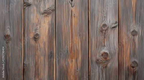 Naklejka premium Weathered wooden panel background, rustic texture for design projects, home decor, and crafting. Natural brown wood grain, knots, and imperfections.