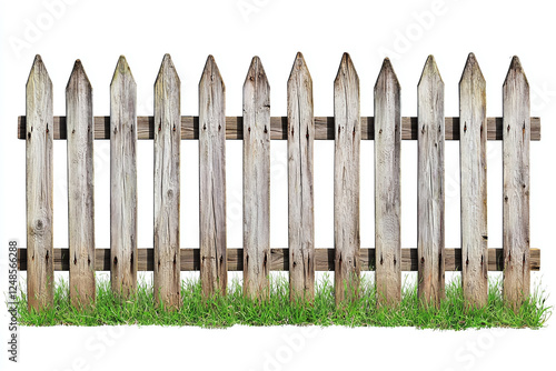 Fototapeta premium Weathered wooden picket fence with green grass in front against a white background, simple and rustic style.