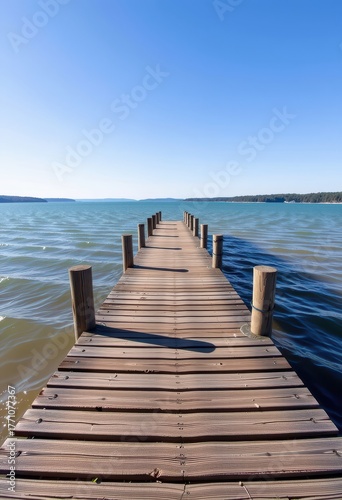 Naklejka premium Weathered wooden pier extending into a calm, vast lake under a clear sky,...
