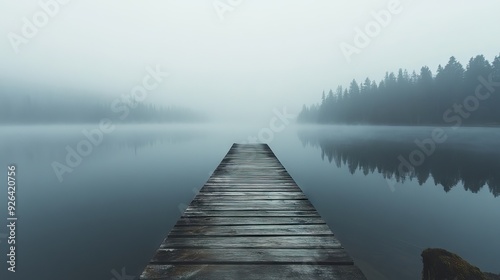© Anar, Fototapeta premium Weathered Wooden Pier Extending into a Foggy Lake with Calm Waters and Dense Forest Barely Visible in the Distance. AI generated illustration