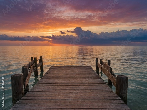 © Tamazina, Fototapeta premium Weathered wooden pier stretches into calm sea, bathed in warm glow of vibrant sunset. Clouds partially obscure sun near horizon, casting orange, pink, purple hues on waters surface.