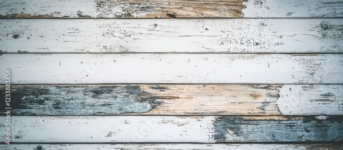 © pngking, Obraz premium Weathered wooden planks background with peeling white paint and natural wood texture ideal for creative design projects Copy Space