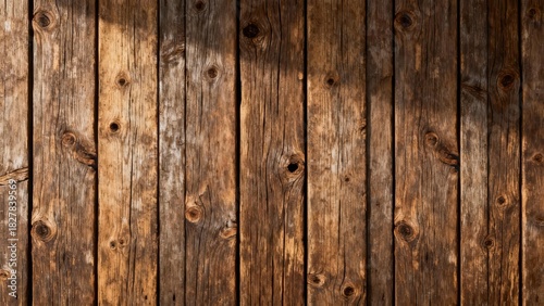 © ibhonk, Fototapeta premium Weathered wooden planks form a textured background illuminated by natural light.