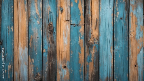 © AugmentArt, Obraz premium Weathered wooden planks with blue and brown hues displaying texture and grain patterns suitable for rustic backgrounds or designs