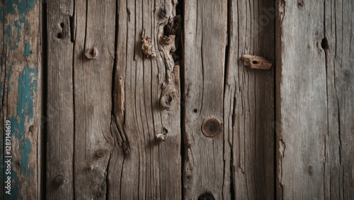 © ArtificialHorizons, Naklejka premium Weathered wooden planks with natural textures and imperfections creating a rustic background ideal for vintage or nature-themed projects