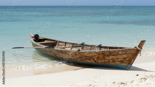 Fototapeta premium Weathered wooden rowboat beached on white sand with turquoise water under a...