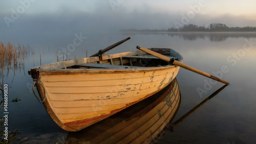 © Adrenaloby, Fototapeta premium Weathered wooden rowing boat resting on misty lake at dawn with perfect reflection capturing tranquil fishing and nature escape