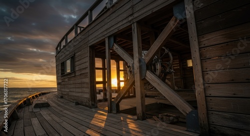 © Studio Stock Noerul, Obraz premium Weathered Wooden Shipwreck Deck at Dramatic Sunset with Ocean Horizon