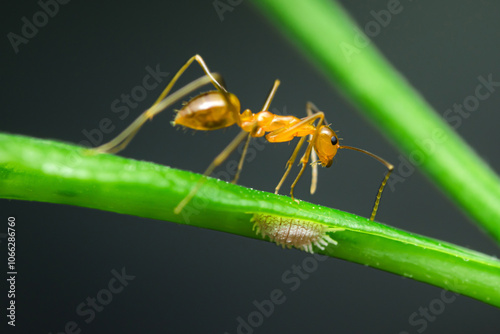Fototapeta premium Weaver ant exploring a green plant stem and mealybug.