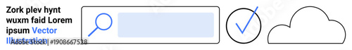 Obraz premium Web interface design, data validation, cloud storage, online search, digital tools, user accessibility. A magnifying glass, search bar checkmark and cloud. Web design and data validation concepts