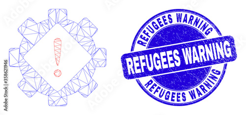 Obraz premium Web mesh gear warning icon and Refugees Warning seal. Blue vector rounded...