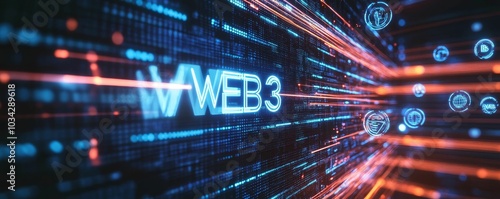 © jambulart, Fototapeta premium Web3 neon sign with glowing lines and icons.