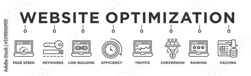 © Icon Designer, Naklejka premium Website optimization banner web icon vector illustration concept with icon of page speed, conversion rate, website traffic, efficiency, keywords, ranking, caching, link building