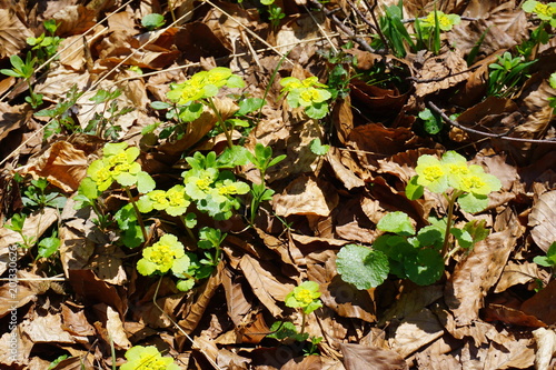 Fototapeta premium Wechselblättriges Milzkraut auf Waldboden, Bayern