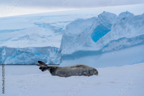 Obraz premium Weddell seal lying on a snowy hill with a glacier in the background in...