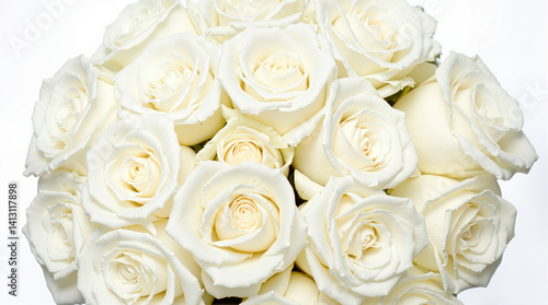 © Viks_jin, Fototapeta premium Wedding bouquet of white rose flowers close up. Beautiful floral arrangement symbolizing pure love and romance. Elegant beauty concept.