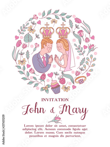 Fototapeta premium Wedding card, wedding invitation. Happy weddings. Vector illustration. Wedding ceremony.