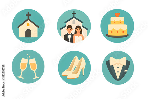 © UpStockIt, Fototapeta premium Wedding Ceremony and Celebration Icons Set — Church, Bride and Groom, Wedding Cake, Champagne Glasses, Bridal Shoes and Groom Suit for Event and Love Themes