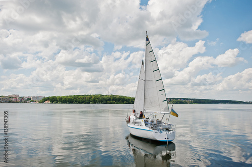 © AS Photo Family, Naklejka premium Wedding couple in love at small sailboat yacht on lake.