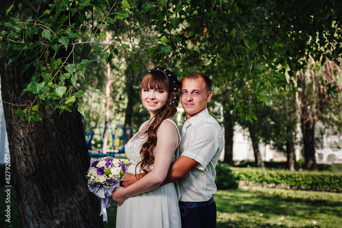 © andreiko, Fototapeta premium wedding couple kissing in green summer park. bride and groom
