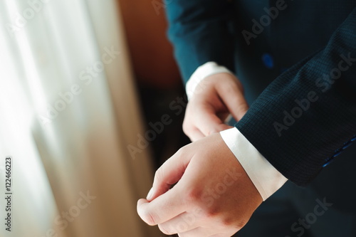 © nagaets, Obraz premium wedding details - elegant groom dressed wedding tuxedo costume