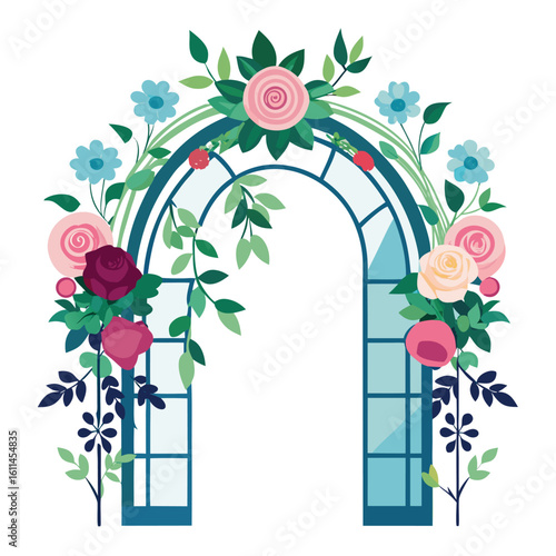 © Khadiza, Obraz premium Wedding floral arch frame window , elegant vector hand drawn invitation border flowers design.