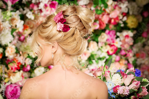 © Miramiska, Fototapeta premium Wedding hairstyle a young girl. Bride. Woman with Flowers in her