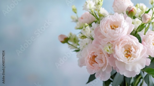 Obraz premium Wedding invitation background with pastel peony bouquet and elegant minimal...