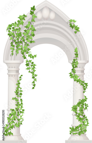 Naklejka premium Wedding pillar gate. Classic elegant stone arch with green branches