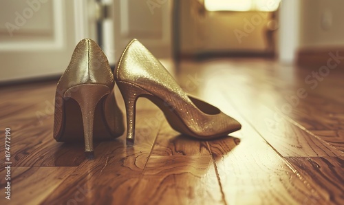 © Md Mojammel, Obraz premium Wedding shoes on a high heel on a wooden floor.