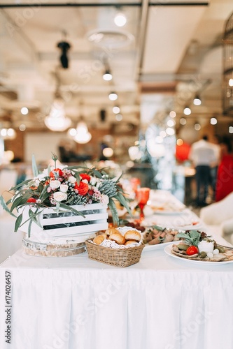 © pavelvozmischev, Naklejka premium wedding table decor newlyweds, details with blurred background