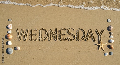 Fototapeta premium Wednesday Beach Day: Seashells, Starfish, and Sandcastles Written in the Sand