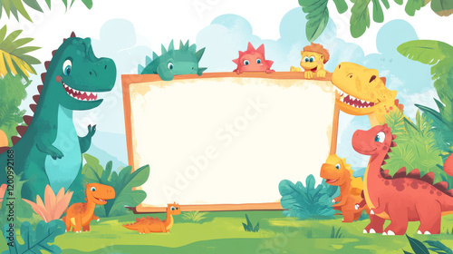 © Sahraya, Fototapeta premium Weekly planner with funny cartoon dinosaur characters. Vector education timetable schedule template. School lesson time table or organizer frame for kids with dino animals in jungle forest landscape