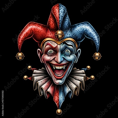© CamClips, Naklejka premium Weeping Jester Face With Jester Hat - Tattoo Design