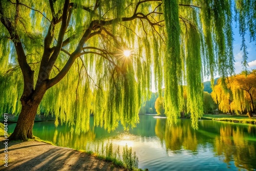 © prapatsorn, Obraz premium Weeping Willow Tree, Elegant Willow Branches, Willow Photography, Willow Tree Landscape, Spring Willow, Willow Silhouette, Nature Willow, Willow Background, Willow Image