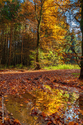 Fototapeta premium Weg durch einen Wald im Herbst, Bayern, Deutschland
