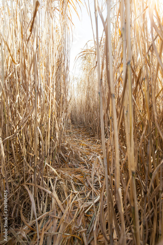 Fototapeta premium Weg durch Schilfpflanzen. Pfade durch Schilffeld. Spielen im Schilf Feld.