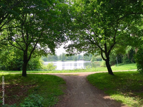 Obraz premium Weg zum See mit Bäumen an den Seiten und einfallendem Sonnenlicht