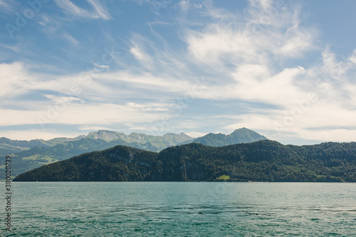 © bill_17, Fototapeta premium Weggis, Vierwaldstättersee, Seeufer, See, Schifffahrt, Seerundfahrt, Uferweg, Wanderweg, Bürgenstock, Alpen, Bürgenberg, Pilatus, Sommer, Luzern, Schweiz