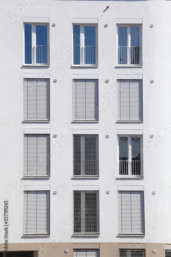 Fototapeta premium weiße Fenster mit heruntergezogenen Rolläden an einer weissen Hauswand, Bremen, Deutschland, Europa
