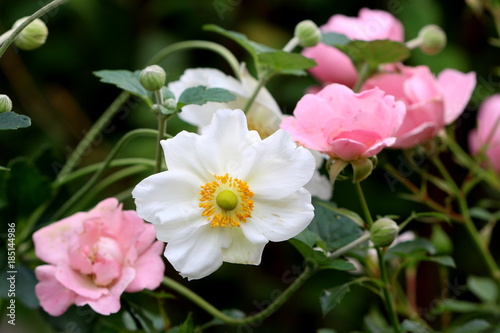 Fototapeta premium weiße Herbstanemone Honorine Jobert und rosa Rosen Sommerwind