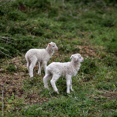 © Sarah, Obraz premium 2 weiße Lämmer der gehörnten Heidschnucke auf einer Wiese
