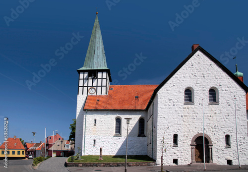 © cmfotoworks, Fototapeta premium Weiße Nikolaikirche in Roenne auf Bornholm