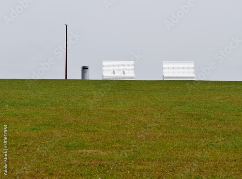 Fototapeta premium Weiße Sitzbänke auf grünem Deich in Büsum