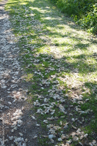 © Malia, Obraz premium Weißer Flaum einer Pappel liegt auf dem Boden. Früchte der Pappel.
