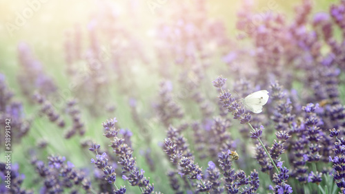Naklejka premium Weißer Schmetterling (Kohlweißling) in einem Lavendelbusch