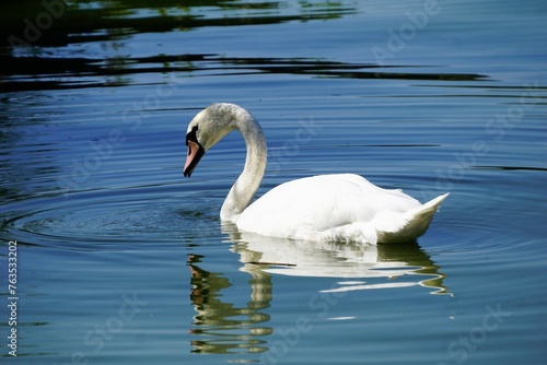 Fototapeta premium Weißer Schwan schwimmt auf einem See und betrachtet sein Spiegelbild im Wasser