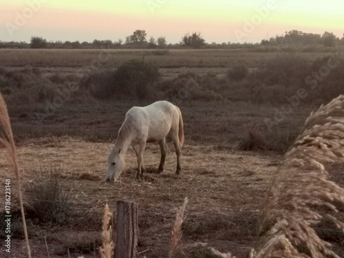 © Jogerken, Fototapeta premium weißes Pferd in der Camargue im Abendlicht